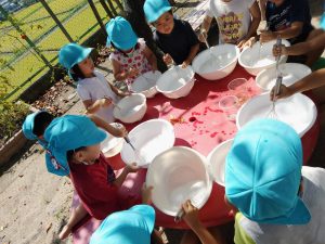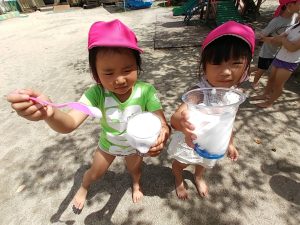 「泡、出来てきたよ~!」と子ども達の声、「ふわふわしてる!」
