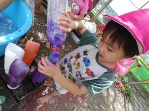 その後、色水を加えたり、カップとスプーンで ままごとをしたり…
