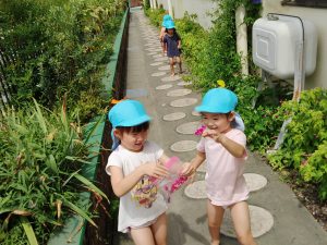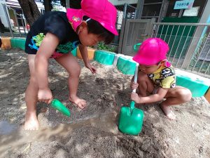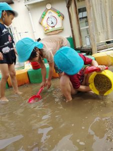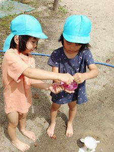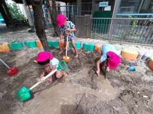 砂場や園庭に水を流して泥んこの感触を楽しみ、見立て遊びにも花が咲きます。