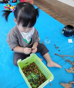 ガチャガチャの空き箱に上手にどんぐりを入れていますよ!