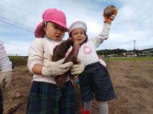 とても嬉しそうに収穫した芋を鞄にしまって「ママに見せるんだ!」「ご飯作ってもらう」等嬉しそうにしていましたよ。