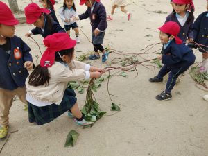 芋のつるを電車に見立てて、みんなで電車ごっこ♪