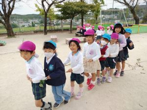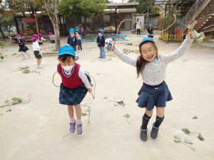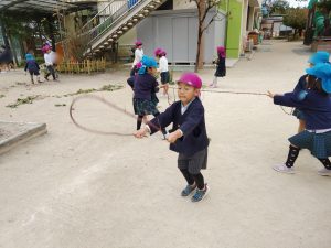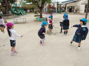 短縄跳びや長縄跳びをしたり、電車ごっこをしたりと思い思いに友だちと楽しむ姿が見られましたよ。