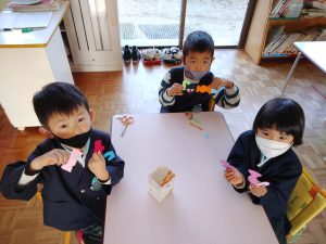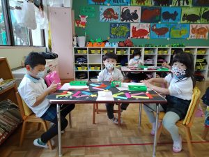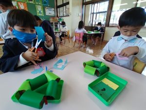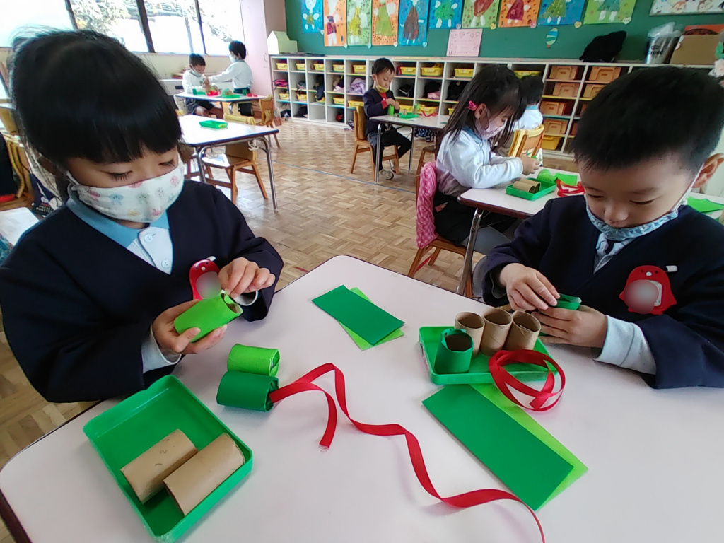 「サンタさんに手紙を書いたんだよ。」「私は電話したよ。」とクリスマスをとても楽しみにしている子ども達。「先生のプレゼントもサンタさんにお願いしてあげる。僕のプレゼントと一緒でいいよね。」などとお話ししながらクリスマスの飾りを作りましたよ。