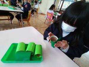 トイレットペーパーの芯に緑か黄緑の好きな色の折り紙を選んで巻きました。折り紙が斜めになったり、トイレットペーパーの芯がはみ出してしまったり、なかなか難しかったですが子ども達は全集中で折り紙を巻いていました。