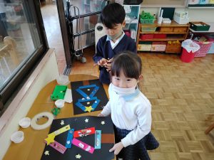 その後は自然探検で拾って来た どんぐり、どんぐりの帽子、小枝を飾りつけたり、アルミ箔で形を作り飾りました。アルミ箔で好きな形を作ると「リボン出来たよ。」「ハートにしてみた。」「先生。見て見て。」と細かく切ったアルミ箔を丸めて「すごいでしょう。」と自慢顔。アルミ箔を使っての形作りは夢中になって楽しんでいました。