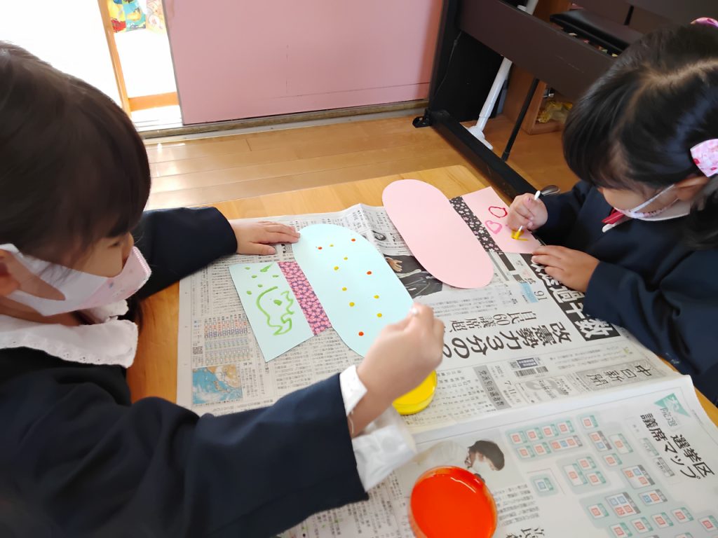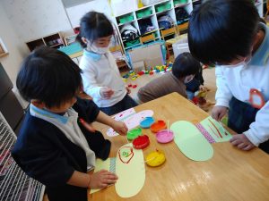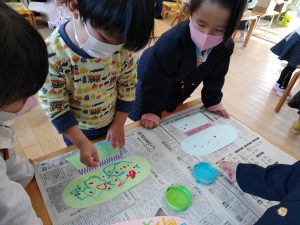 スタンプのように綿棒をトントンと押していく子、「ハート描きたい!」と形を描いてみたり、線を描いて「なんだかへびさんみたい!」と面白い模様ができました。子ども同士「みてみて!」「こんなのできたよ」と嬉しそうに見せあっていました。