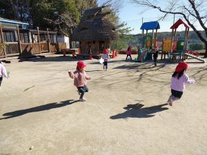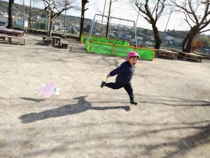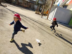 凧が完成したら外に出て凧あげをしましたよ。元気よく走って凧があがったり、自分の後ろをついてくるのを喜び、あちこちから楽しそうな笑い声がいっぱい!