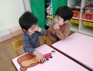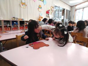 そして友達と目を瞑って楽しんでいると「お目々隠してあげるー!」と子ども同士で隠してあげる姿も見られましたよ!自分達で考えて目を隠す姿に感心しました。新年から沢山の笑い声が響き渡るちゅうりっぷ組でした!
