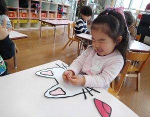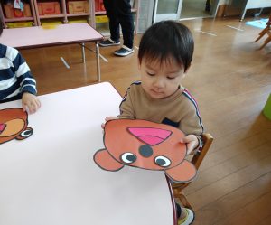 まずは目を開けたまま目、鼻、口のパーツを置いていき、、くまさんの完成!位置をしっかり理解して楽しんでいましたよ。