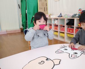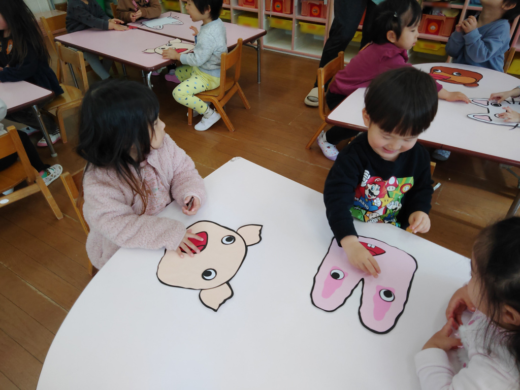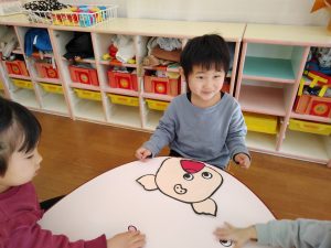 「あけましておめでとう!」保育士が挨拶をすると上手に真似て挨拶を返してくれました!2023年も元気いっぱいにスタートしたちゅうりっぷ組です!新年明けて凧揚げ、福笑いの伝承遊びを楽しみました。福笑いは子ども達の大好きなノンタンシリーズで、「ノンタンがいい!」「くまさんやりたい!」と大人気です!!