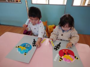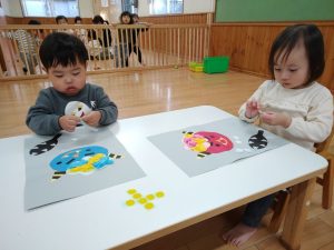 上手にシールを剥がすと「おにはーそと、ふくはーうち」と言いながら楽しそうに貼る子ども達!