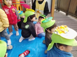 節分当日作ったお面をつけて見に行きました。鬼が現れると「キャー」と保育士に抱きついて涙を流す子、鬼に見つからないように隠れる子がいましたよ。