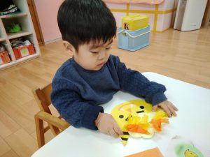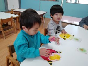 上手に丸めて「ペッタン」と貼っていましたよ。完成するとお面を顔の前に持ってきて「オニだぞ〜」と友達同士で楽しむ姿もありました。