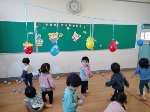 鬼の風船に当たると「あたったー」と大喜びの子ども達!何度も投げて楽しみました!
