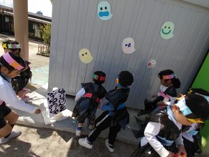 手裏剣の修行では、お化けめがけて手裏剣を投げていきます。見事お化けに命中すると跳びはねて大喜びしていましたよ。「お化けやっつけれた!」と誇らしげでした。