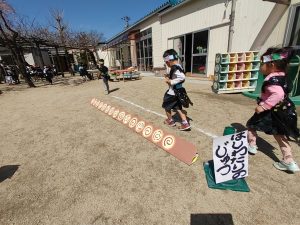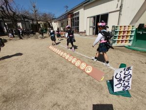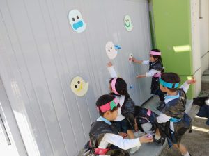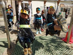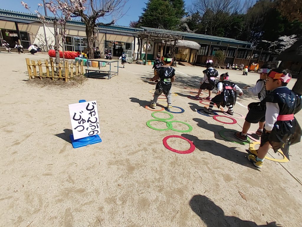 園庭にて忍者道場として様々な修行を楽しみました。これまでに数々の修行を積み重ねてきた子どもたち。部屋に巻物が届く度に「早く修行したい!」「忍者さんどこにいるのかな?」とワクワクした様子。忍者道場への招待状は、忍者が窓から巻物を投げ入れ「えーー!忍者がおった!」「だって黒かったもん!」「やったー!」などと大喜びでしたよ。それでは忍者道場のはじまりはじまり〜!