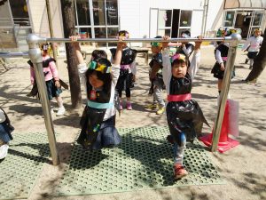 ぶら下がりの術では、鉄棒にぶら下がり、足がつかないように我慢!保育士が5秒数える間、どの子も顔が真剣!数え終わると笑みがこぼれ、安心した様子!