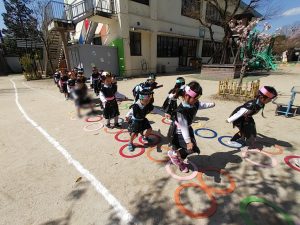 ジャンプの術では、輪からはみ出さないようにけんけんぱをして進みます。