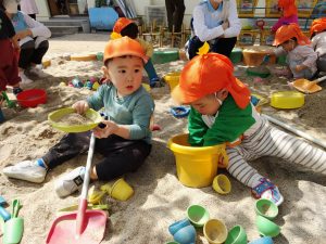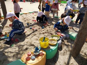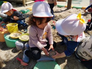 砂場遊びは子ども達が大好きな遊びです。スコップで上手に砂をすくえるようになってきて、ごちそうが出来上がると「どうぞ!」と持ってきてくれますよ。