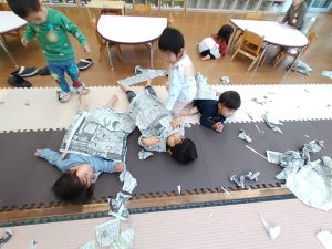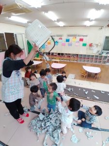 新聞紙遊びも大盛り上がり!「雨が降ってきたよー!」と降らすと「キャー!」とたくさんの歓声があがりましたよ。これからも、保育園って楽しいな!と笑顔がいっぱいで過ごせるよう楽しい遊びをいっぱいしていきたいと思います。