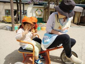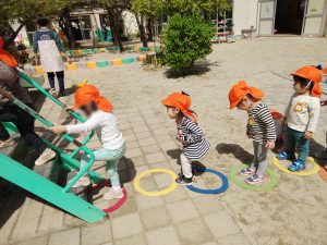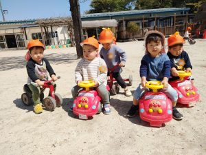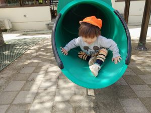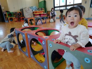 新入園児も迎えて元気いっぱいの赤、青ちゅうりっぷ組がスタートしました!「お母さんがいっちゃったよー!」と涙がいっぱいだった子ども達も、いろいろな遊びに夢中になると日に日に笑顔が増えてきています 。