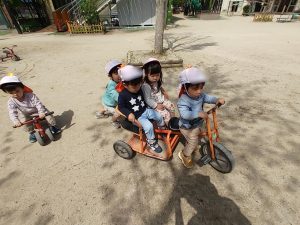 タクシーはみんなで仲良く交代しながら楽しんでいますよ。運転手にお客さん、後ろから押してくれる子など関わり合いがたくさん見られます。