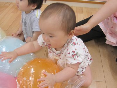 十分に風船で遊んだ後は、なんとなんとベッドに大変身!掃除機で圧縮袋の空気を抜く保育士の様子をジッと見つめ、保:「乗っていいよ~!」の声にジャーンプで思いきり乗る子もいましたよ。ちょっぴり怖くて遠くから見ている子・ひよこ組の低月齢の子は保育士が支えながら乗り、座ったり寝転んだりしていつしかベッドに興味津々でした。