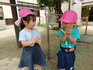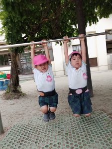 ぶら下がった後は友達と顔を見合せ「やったー出来たね☆」と嬉しそう。でも「ちょっと手が赤くなっちゃった」頑張った証拠ですね!!