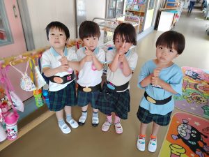 5月より取り組み始めた忍者ごっこ。手作りのベルトをつけると…「忍者に変身!!」とかっこよくポーズを決める子ども達。
