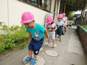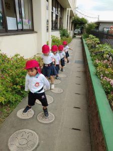 今取り組んでいるのは、1つ目は『忍法グーパーの術』アンパンマンの道を足を閉じたり開いたり…「グーパーグーパー」と言いながら進みます。足を揃えてジャンプするのが少し難しくみんな真剣な顔。