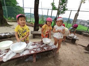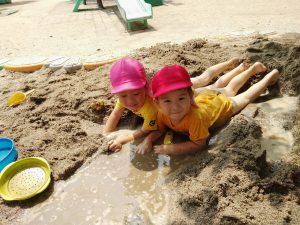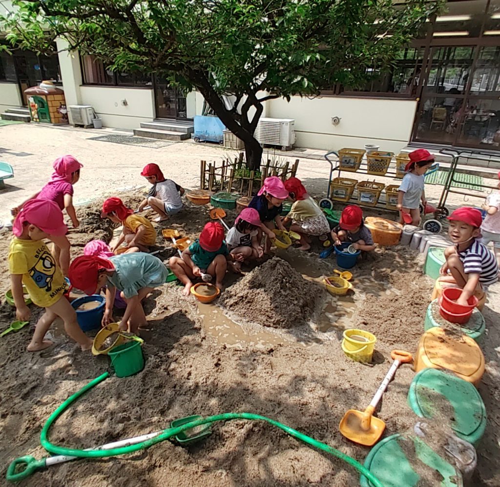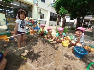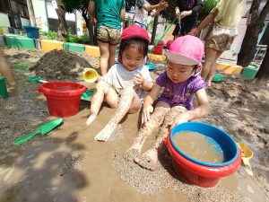 プールがない日に泥んこをしました。最初は少し離れたところから友達の様子を伺う子もいましたが、楽しいということがわかると満面の笑みで泥遊びが始まります。
