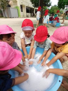 年長児に混ざり泡遊びをしました。たらいに手を入れながら「バシャバシャすると泡立つよ」とお兄さん、お姉さんが教えてくれ真似してやってみると…