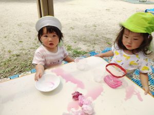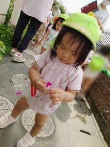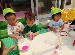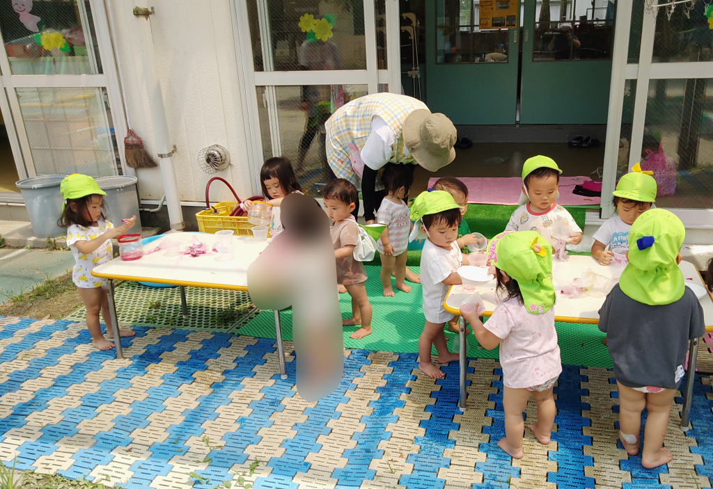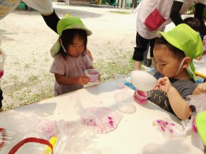 7 月に入り暑い日が続いています。梅雨の晴れ間を利用して色水あそびをしました。