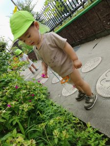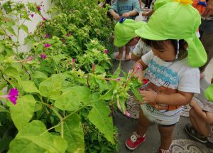 「ピンクのお花をとってね」と声をかけ、保育士がやって見せると、そぉっと手を伸ばしプチッっと優しく摘んでいました。