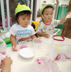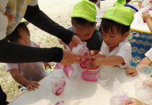 保育室前に戻り、ビニール袋にお花と水を入れてみんなでモミモミ。。。