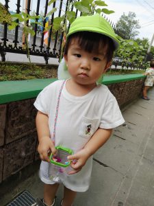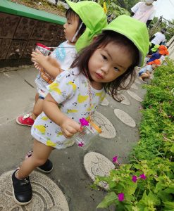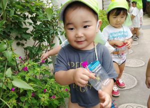 ペットボトルのポシェットを肩からかけ、アンパンマンの道に咲くピンクのオシロイバナを摘みに出発!
