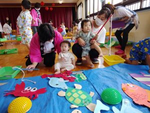 部屋で盆踊りをした後、みんなでホールへ行きくじらのゲームをしました。