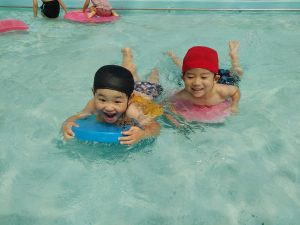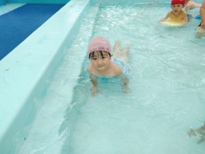 少しずつ水に慣れてきて、顔つけや大きいビート板でのバタ足にも挑戦しています。