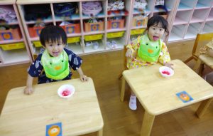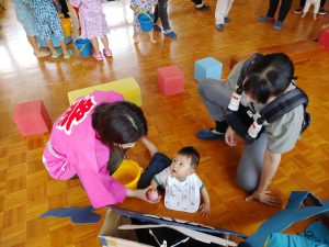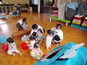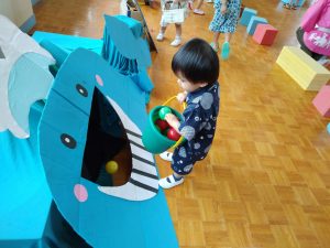 お店屋さんになってくれたのは、年長組のゆりさん、ふじさん。まずは、「くじらさんあ〜ん」で遊びました。未満児さんは、くじらさんに近づいて、大きなお口をのぞき込むようにパクッ!と食べさせます。