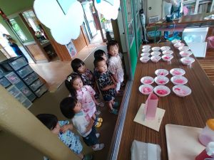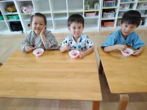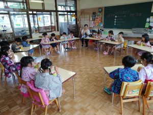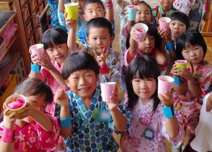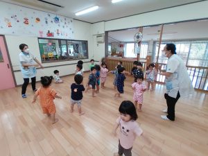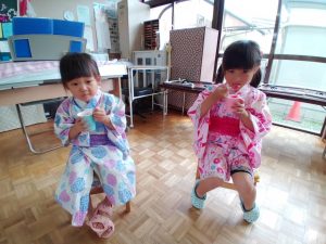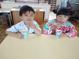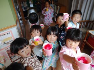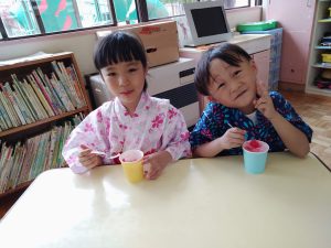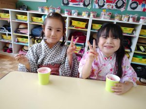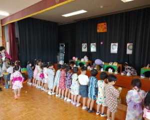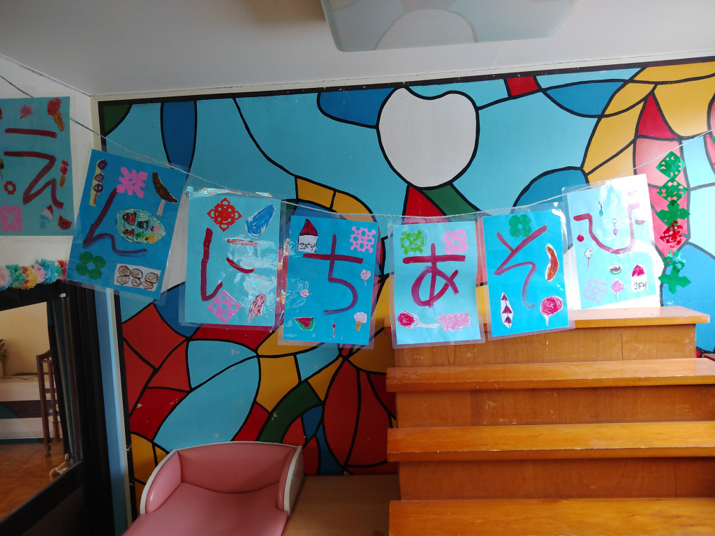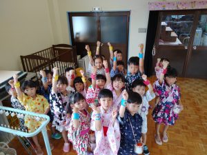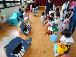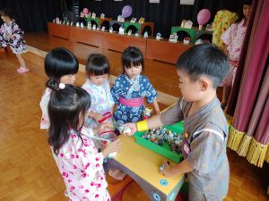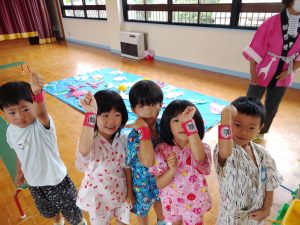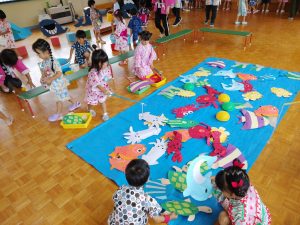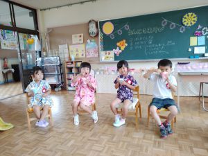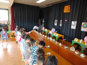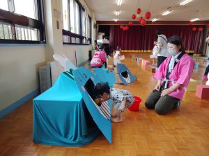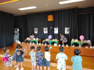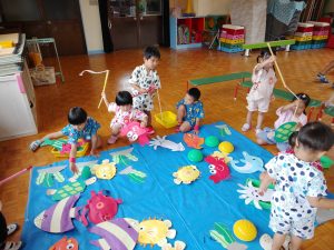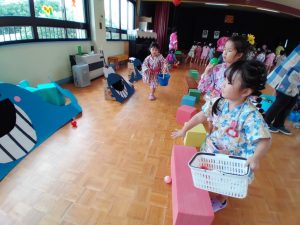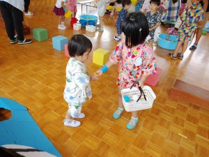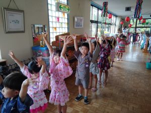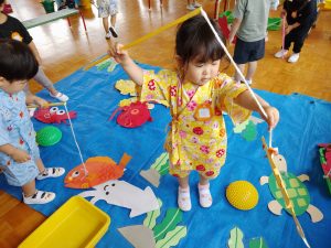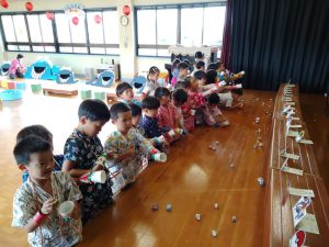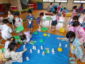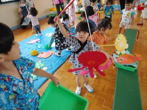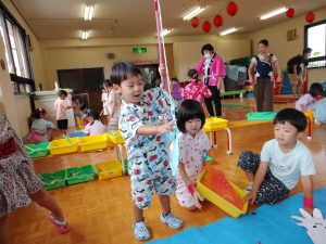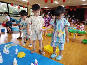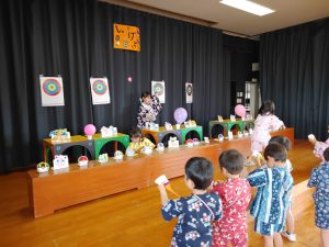 縁日遊びでは、各学年でお部屋の中や廊下で盆踊りを踊ってから、ホールで「くじらさんあ〜ん」「魚つり」「射的」などのお店屋さんで遊びました。