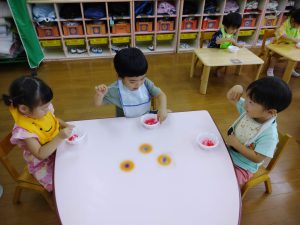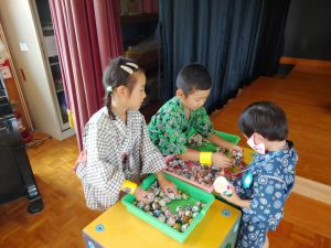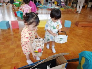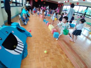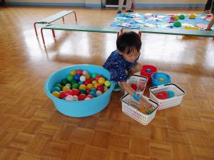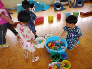 年長組のお店屋さんは、お客さんが遊べるように、カゴやバケツにボールを入れてあげます。