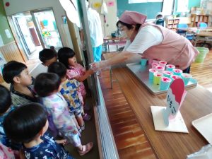 射的の玉を渡すお店屋さんは、お客さん一人ひとりに約束の数を守って渡します。さすが年長さんですね。