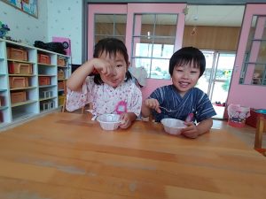たくさん遊んだ後は、かき氷屋さんに行きました。冷た〜いかき氷に大喜び!!