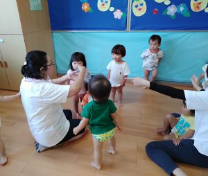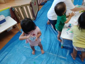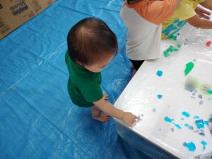 「ぷるぷる〜」「ちゅめたーい」と言葉を覚え始めた子どもたちが、声に出しながら触ります。