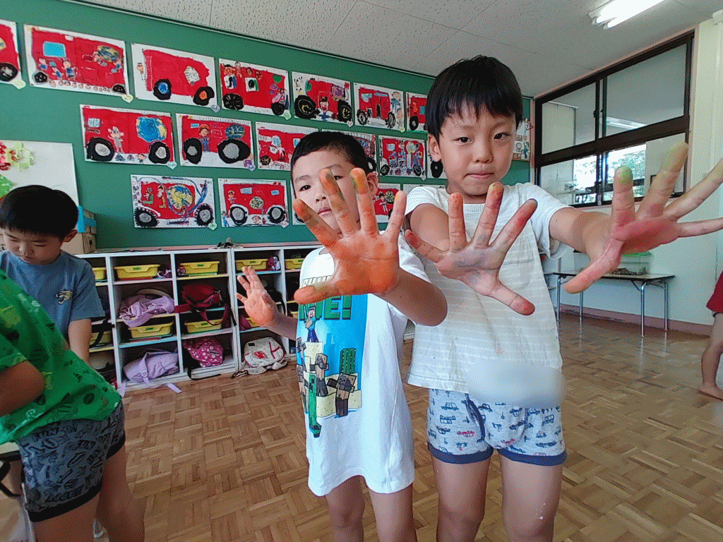 原液に近い絵の具を何回も何回も重ねてスタンプしたため、色がにじむことなく色の重なり合いを楽しむことができました。画用紙いっぱいにスタンプして素敵な作品ができました。