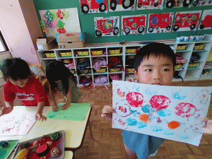 「こんなにスタンプできたよ」と、どの子も嬉しそうに見せてくれました。この野菜スタンプもトイレットペーパーの芯のスタンプもこの後素敵な作品になるので楽しみにしていてくださいね。お野菜のご協力、ありがとうございました。