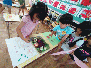 「この野菜はなーんだ」と野菜を一つ一つ観察しながらスタンプした形も見て楽しんでいました。