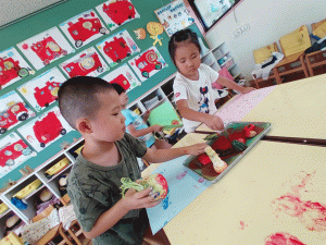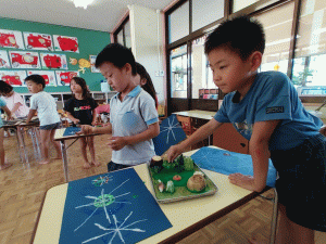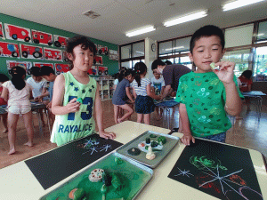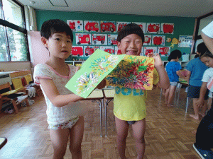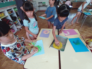 このスタンプした絵は花火をイメージして思い思いにスタンプをしました。出来上がった花火の絵は、各クラスに飾ってあるのでそちらもご覧ください。