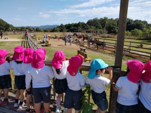 馬を見つけると「うわぁ~大きい!」「赤ちゃんもいる!」「白や茶色、黒の子もいる!」と興味津々な子ども達!